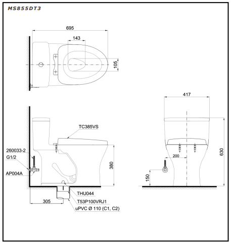 Bàn cầu 1 khối kèm nắp đóng êm TC385VS – MS855DT3
