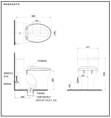 Bàn cầu 1 khối kèm nắp đóng êm TC393VS – MS855DT2