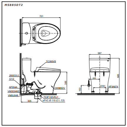 Bàn cầu 1 khối kết hợp nắp đóng êm TC393VS – MS885DT2