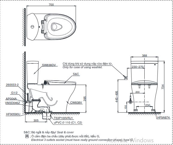 Bàn cầu hai khối CS838DW7 còn đi kèm bích nối sàn và van dừng, giúp việc lắp đặt dễ dàng và thuận tiện hơn bao giờ hết. Với nguồn điện 220V, 50/60Hz, sản phẩm hoạt động ổn định và tin cậy, đáp ứng mọi nhu cầu của bạn trong phòng tắm.