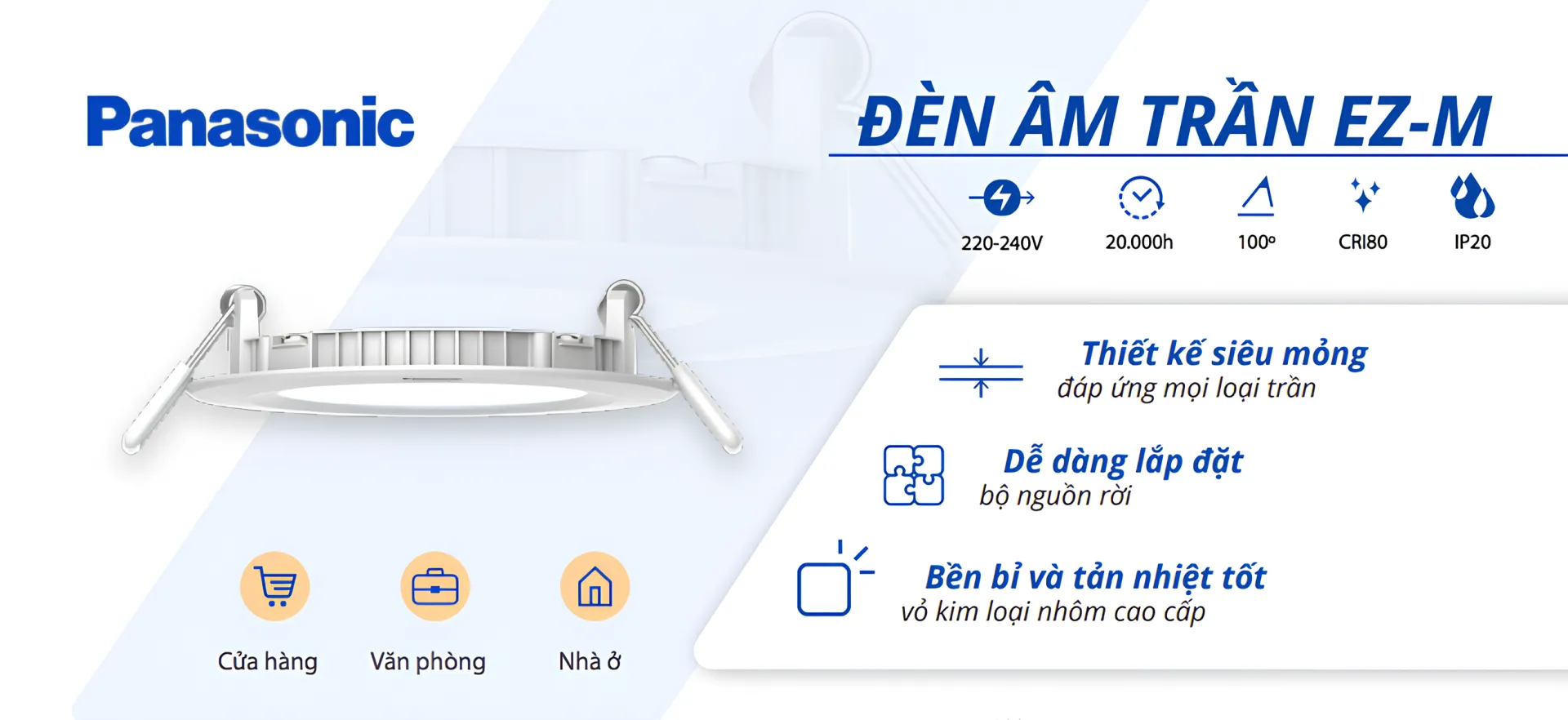 Sản phẩm đèn LED âm trần Panasonic Panel đổi màu EZ-M nổi bật với thiết kế siêu mỏng đáp ứng mọi loại trần nhà, dễ dàng lắp đặt với bộ nguồn tách rời và bền bỉ, tản nhiệt cực tốt với vỏ bằng kim loại nhôm cao cấp. Sản phẩm phù hợp với các không gian như cửa hàng, văn phòng, nhà ở,… Khả năng chiếu sáng của đèn siêu mỏng cũng không thể bị xem thường khi lên đến 1200lm với hiệu suất phát sáng chỉ 80lm/w tiết kiệm điện tối đa.