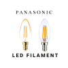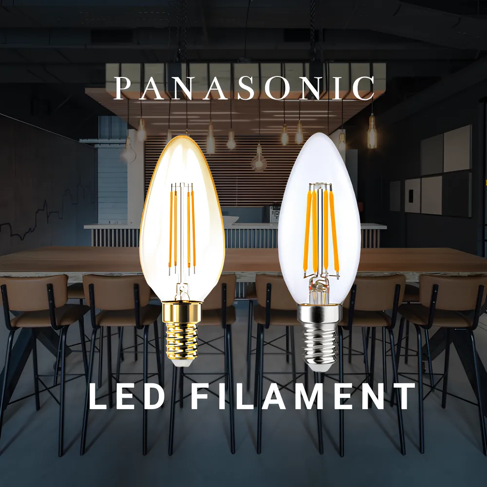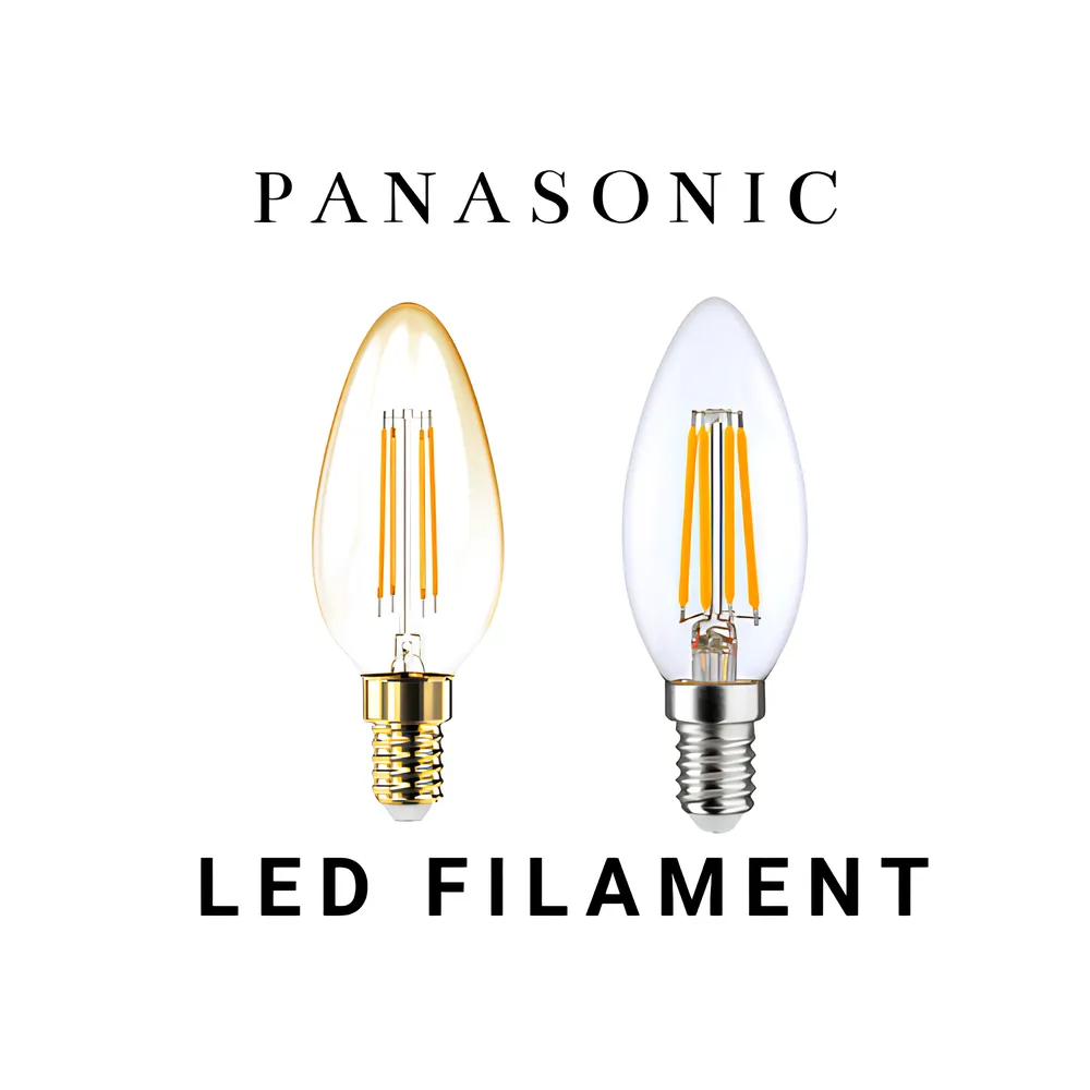 Đèn Led Bulb Filament Panasonic là đại diện tiêu biểu cho phong cách chiếu sáng công nghiệp và vintage, mang lại sự khác biệt rõ rệt cho không gian của bạn. ình dạng Bóng C (Candle Shape) thon dài và duyên dáng, lý tưởng cho mục đích trang trí, thon dài, thường được gọi là bóng Edison, với lớp vỏ thủy tinh màu hổ phách hoặc trong suốt. Công suất lý tưởng tạo ra ánh sáng vàng ấm áp, dịu nhẹ, chuyên dùng để trang trí và làm nổi bật các thiết kế nội thất mộc mạc.