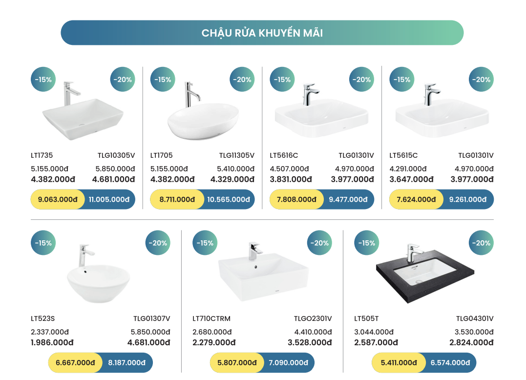 Siêu khuyến mãi, siêu đặc biệt, khi mua chậu rửa TOTO, tiết kiệm chi phí từ 15 đến 20%. Hãy nhanh tay lựa cho mình một model phù hợp cho phòng tắm của gia đình mình bạn nhé!