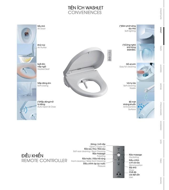Nắp rửa điện tử Washlet Toto là loại nắp bồn cầu thông minh vÀ hiện đại. Có thể đóng mở tự động, chế độ rửa sau, phun sương bồn cầu, sấy khô, sưởi ấm nắp bồn cầu, tính năng massage vô cùng êm ái. Ngoài ra còn một số chức năng khác đi kèm mang lại cho người tiêu dùng nhiều tiện ích.